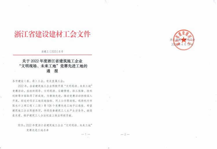 由我司承建的陽明故居及紀(jì)念館EPC總承包項(xiàng)目、綠云路智慧快速路一標(biāo)喜獲2022年度浙江省“文明現(xiàn)場、未來工地”競賽先進(jìn)工地。